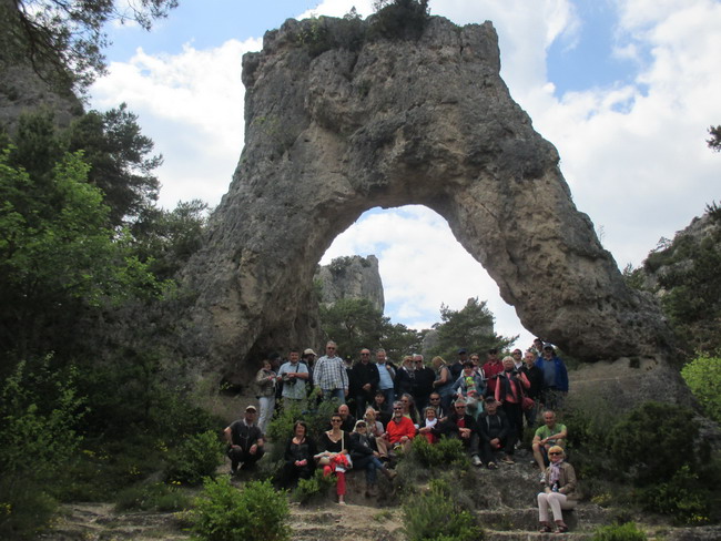 Vers 14 h30 nous prenons le train pour une heure à la découverte des merveilles sculptées par le temps, le regard et l'objectif photo guidés par le commentaire de notre « mécanicien » le nez de Cyrano, les yeux du blaireau, le chas de l'aiguille, la tête d'Arlequin etc. Et une photo de famille sous la porte de Mycènes vue dans « La Grande Vadrouille » de Gérard OURY, que c'est beau la France !