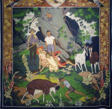 Direction Aubusson où nous retrouvons le soleil. Pour ne pas faire «tapisserie» comme on dit dans la région, nous allons visiter la Cité Internationale De La Tapisserie. Ouverte depuis 2016 cette exposition nous permet d'approcher des produits de luxe, métier d'art, d'excellence et de tradition locale, la tapisserie d'Aubusson est faite de près de six siècles d'histoire et se renouvelle aujourd'hui dans la création contemporaine. Étonnantes créations "Les mains dans les yeux" de Frédérique Morrel qui détourne canevas kitsch et tapisseries à l'aiguille vintage pour en habiller faune fantastique ou de petits objets, tantôt trophées de chasse, tantôt mobilier chimérique... L'espace "Tapisseries du monde" prend des allures de cabinet de curiosités chamaniques ! Plus qu'une sortie CARMS, c'est une initiation à l'art contemporain que nous aurons durant ces quelques jours.