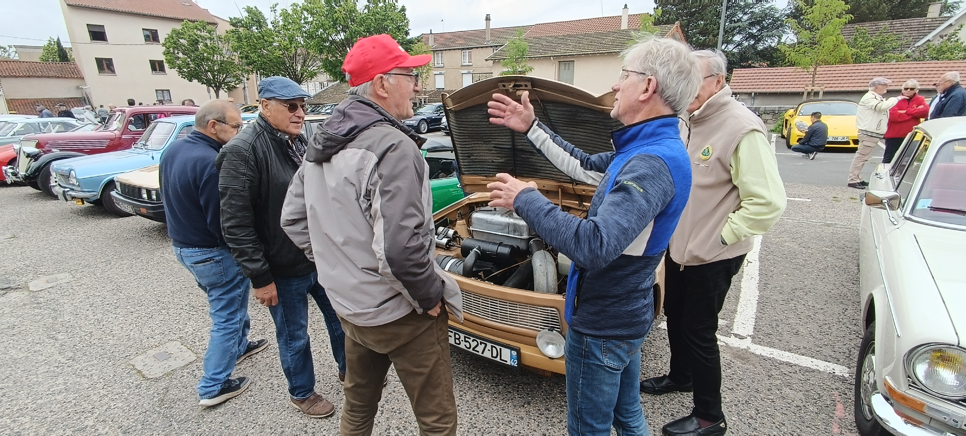 Dans un autre style, une TRABAN 601L de 1987, rapatriée de Roumanie où son actuel propriétaire séjournait pour raisons professionnelles. Cette auto c'est un peu la 2 CV des anciens pays communistes de l'est. Ou la voiture de peuple de l'Allemagne de l'Est en comparaison à la Cox de l'Allemagne de l'Ouest. On dit chez nous quelle serait née des amours d'une Citroën 2cv et d'un vélo SOLEX. D'ailleurs son propriétaire nous dit que lorsqu'il va faire le plein à la station essence, il prévient l'automobiliste derrière lui que cela va prendre un peu de temps. En effet le réservoir situé sur le haut du moteur demande du SP95 mais un dosage précis d'huile pour éviter les nuages de fumée à la sortie du pot d'échappement. Construite de 1964 à 1990 par VEB Saschsenring à ZWICKAU en Saxe a de nos jour sur cette place Bouvier, comme une voiture exotique avec ses 594cm3 et ses 615kg.