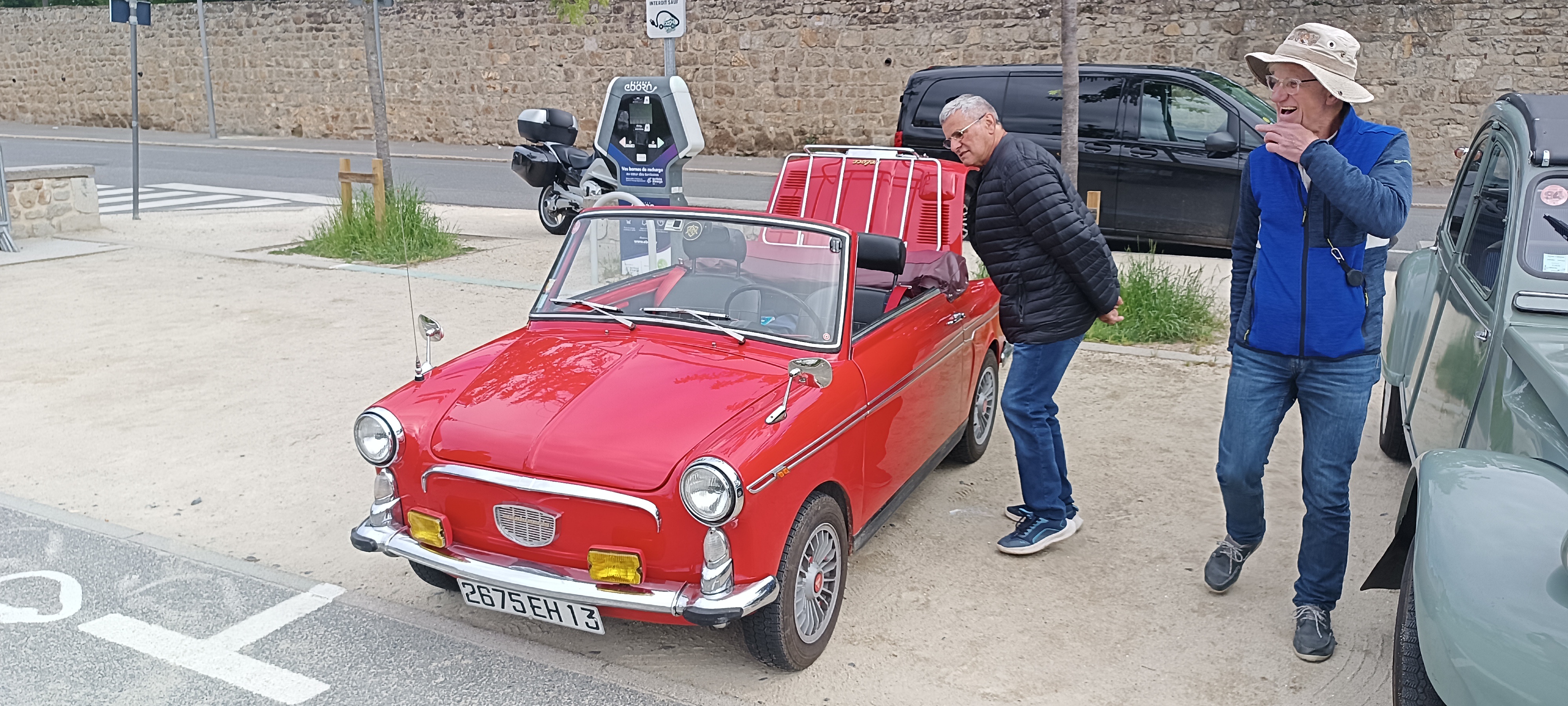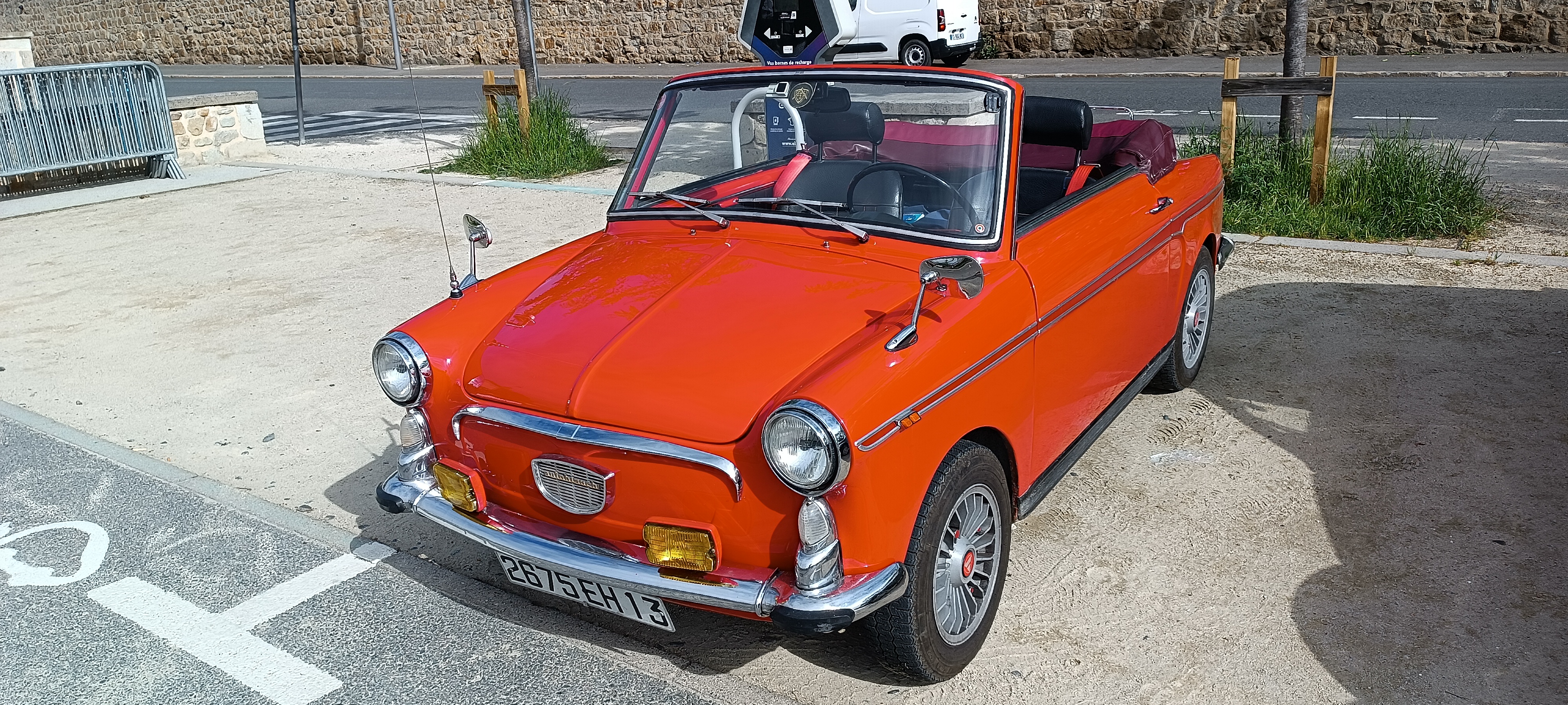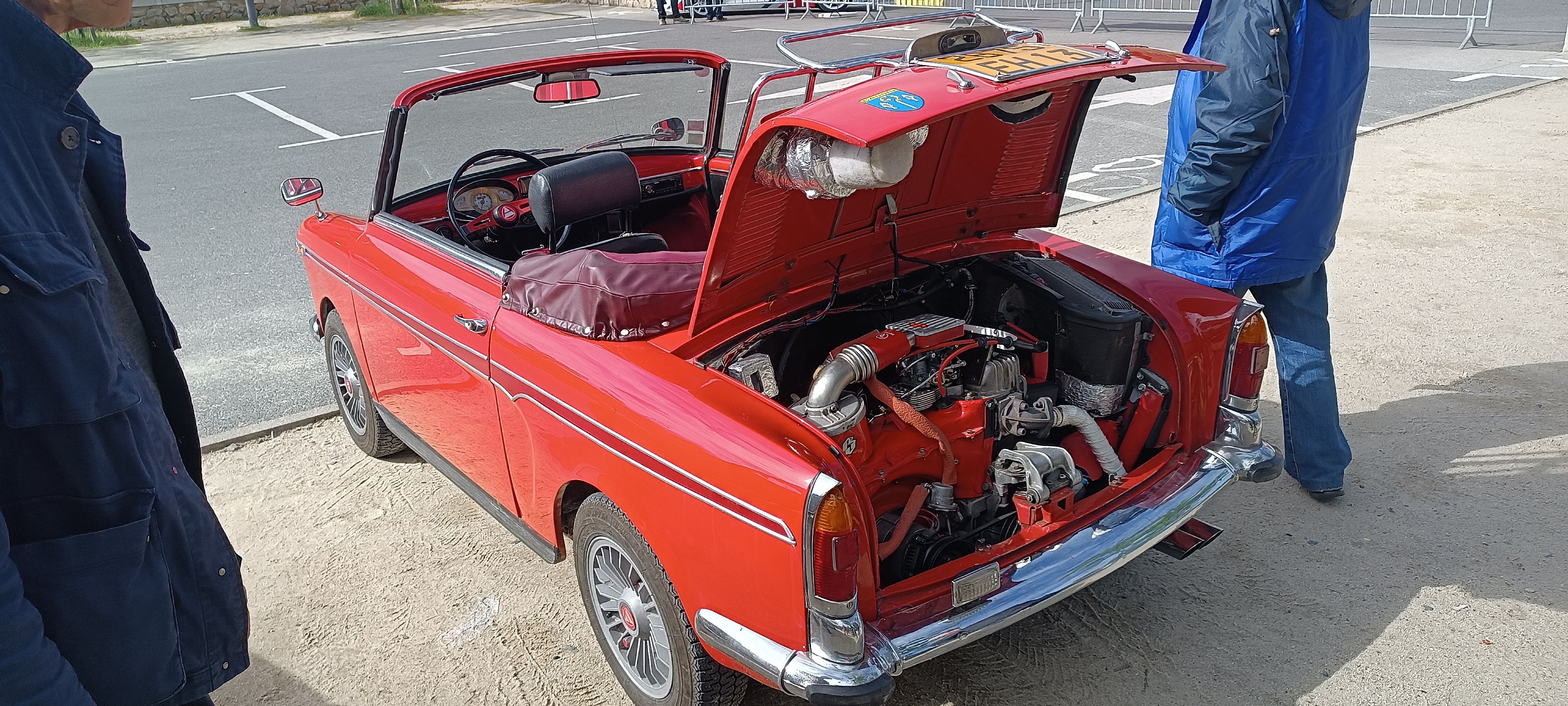 C'est sur une base de FIAT 500 avec ses 3,04m que cette petite italienne sent bon la "DOLCE VITA" des années 60 et lors de sortie elle respirait avec son look des années 50: elle était déjà rétro pour l'époque. Son propriétaire me confit avoir fait quelques modifications notamment pour évité la chauffe de son petit 2 cylindres FIAT par un système maison mais astucieux. Avec un poids d'environ 500kg, les 21 cv ont déjà emmenés madame et monsieur dans de grandes aventures routières. Nous leurs souhaitons du soleil sur la suite de leur périple pour profiter pleinement à leur rythme du soleil.