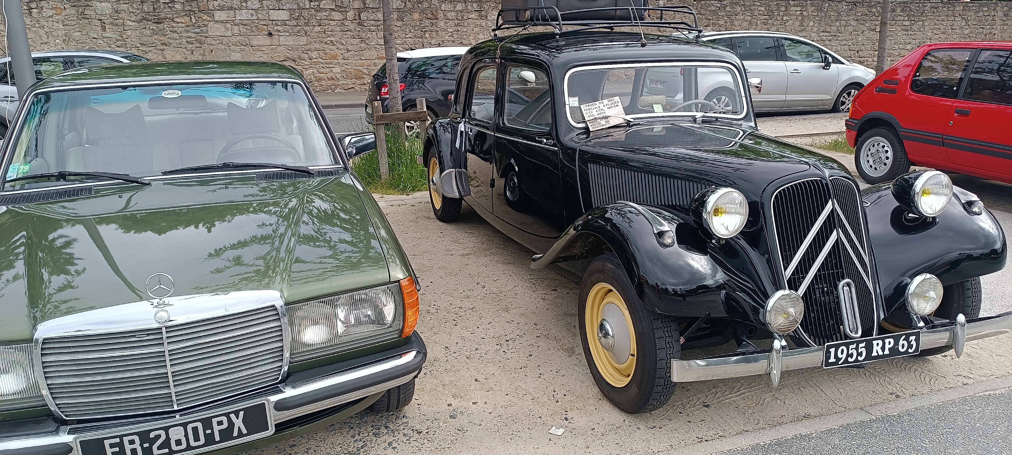 Le «Gang des Citroën C4 d'avant guerre» est présent avec Joël, Bernard et Daniel. Deux CITROÊN 2 cv flambantes neuves entrent sur le parking de la place Bouvier. Je m'approche et recherche les propriétaires. L'une attire mon attention car je ne connais pas cette série limitée dont Citroën savait si bien faire pour faire perdurer le mythe de cette auto. Son propriétaire amoureux de la marque aux chevrons m'explique que ce modèle CHIC est en fait la dernière invention de la marque après la CHALESTON en 1990. Malheureusement le prototype sera construit mais ne sera jamais mis en production et le règne de la "2pattes" s'arrêtera en 1990 et l'auto rentrera dans l'histoire. Le projet de faire revivre cette 2 cv est réalisé par AJ Carrosserie qui devrait voir le jour dès cet automne du côté de Veauche. De «la belle ouvrage» comme on dit.