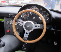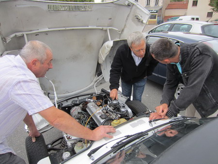 Notre ami Patrick C. arrive au volant d'une Mini achetée pour que madame puisse avoir sa voiture de collection.