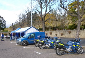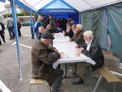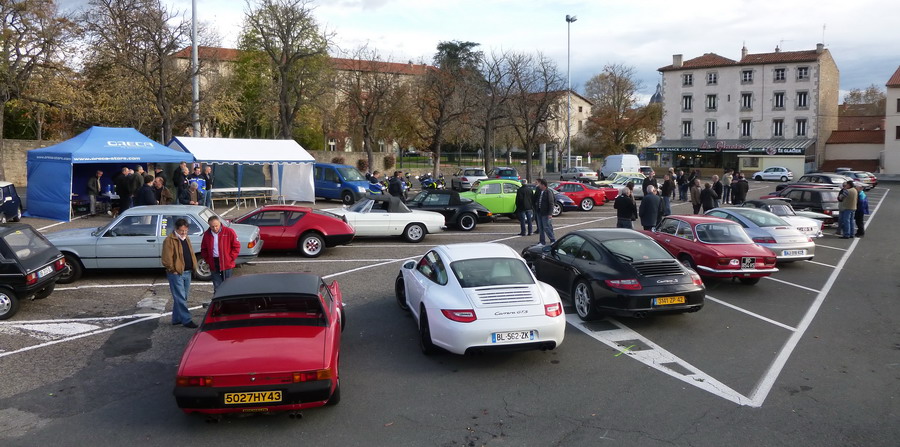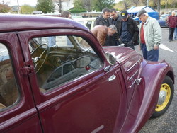 8H15, une quinzaine de membres des plus actifs du club sont sur place pour le montage des chapiteaux, des tables, le tout sous les couleurs du club. Une fois le décor planté les fourneaux sont allumés pour la préparation des tripes organisées par Raymond. 9H00 un escadron de gendarmes motorisés arrivent sur place pour admirer les voitures et remarque l'état de restauration et d'entretien du parc d'exposition. L'un d'entre-eux échangerait bien sa moto bleue contre le BAJA-COX d'Hervé. Comme à chaque rassemblement des nouveautés se présentent place Bouvier. Une restauration haut de gamme pour cette TRIUMPH TR 250 6 cyl de 1968 qui est proposée à la vente par son propriétaire. Une CHEVROLET Corvette C2 Sting Ray cabriolet à moteur V8 de 1964 d'un stéphanois. Sur le parking les conversations vont bon train.
