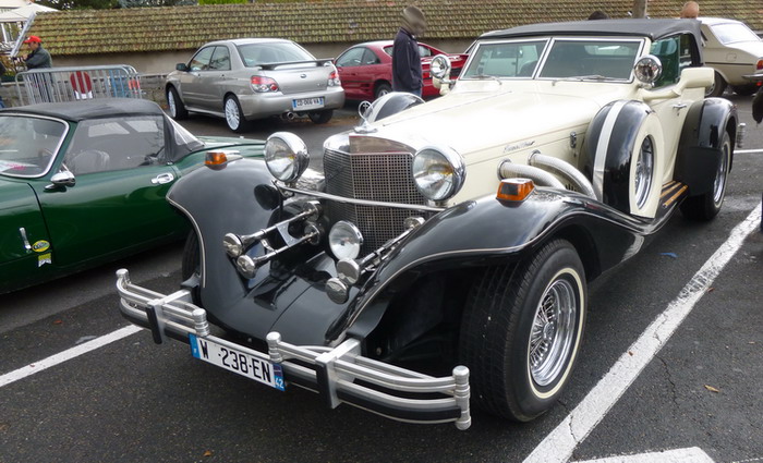 11H00 arrivent une belle FERRARI 360 Modena puis une luxueuse et imposante EXCALIBUR à moteur V8 CHEVROLET 5.7L -238 ch de 1983 (une évocation de la MERCEDES SSK de 1928). Vingt deux PORSCHE seront comptabilisées par Roland le grand spécialiste de la marque au CARMS. Tandis que les tripes se dégustent sous notre chapiteau, une pluie battante fait son apparition et ramène les visiteurs à l'abri de la buvette (événement météo fortement apprécié par notre trésorier).
