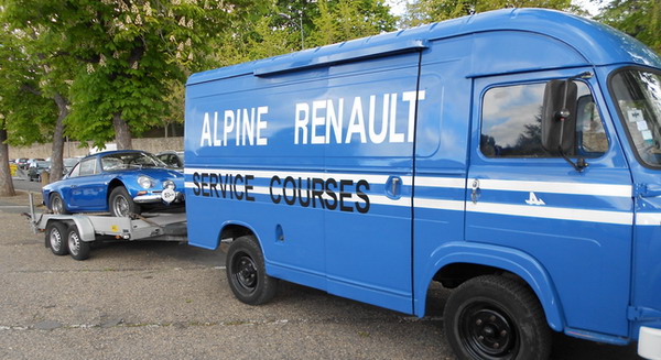 Aujourd'hui notre expo reçoit la visite des alpinistes (pas ceux avec piolets et sac à dos) du club Alpine Forez Velay venu avec une dizaine de modèles. Raymond notre responsable logistique et possesseur d'une A110 V85 de 1975 avait préparé la venue de l'AFV et nous avait promis une surprise. Pour du lourd, nous avons eu droit à du lourd avec l'arrivée d'un SAVIEM SG2 aux couleurs ALPINE RENAULT Service Courses avec sa remorque et une A110 1600 comme à la Grande Époque ? où la marque brillait en Championnat du Monde des rallyes.