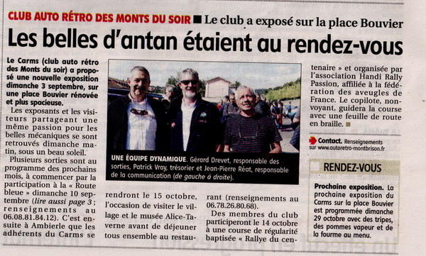 Nos expositions/rencontres rassemblent les passionnés de toute la région, ils viennent de plus en plus nombreux, soit individuellement soit en groupe, comme nos amis du «Team des balcons» venus avec 8 voitures faire une heure de halte place Bouvier avant de continuer leur route vers «l'aventure Michelin».