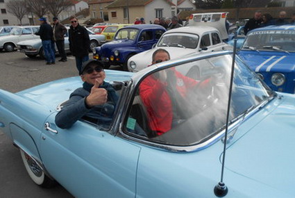 Comme à chaque fois les américaines font aussi le charme de nos rencontres. Une belle FORD Thunderbird 1956, V8 de 245 cv, aussi appelée « T Bird » dans sa livrée bleu ciel prend le soleil sur la place Bouvier. Son propriétaire venu de BOURG EN BRESSE à trouvé cette auto d'origine française dans la Saône et Loire. Tout est gardé d'origine, quelques petites bosses prouvent que cette voiture a vécu une vraie vie d'automobile. Juste un voile de peinture en 1998. Le possesseur de cette auto trouve qu'il y a une bonne ambiance dans notre rassemblement et se promet de revenir nous voir avec l'une de ses autres américaines.