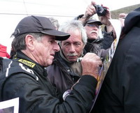 L'Alpine A 110 1800 Gr. IV, arrive, à peine sorti, Jeannot est pris dans une mêlée de carmistes et, avec sa gentillesse habituelle signe les affiches sans oublier de faire le clown ! Nous immortalisons l'instant pour authentifier ses dédicaces.
