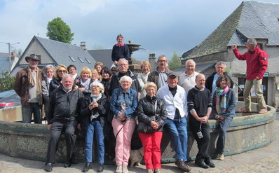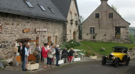 Après avoir traversé d'immenses pâturages piquetés d'anciens burons et des centaines de vaches rouges, arrêt à la Godivelle, commune à la fois la plus haute du Puy de Dôme et la moins peuplée (22 habitants !). Village caractéristique avec ses puissantes maisons de granit, abreuvoir géant à la mesure de ses belles estivantes aux yeux langoureux. Sa grande fontaine ronde vidée de ses eaux accueille les Carmistes et pour la photo souvenir ! Et en prime, une dizaine d' " anciennes ", Trèfle Citroën, en visite elles aussi à la Godivelle entre lac d'en haut et lac d'en bas.