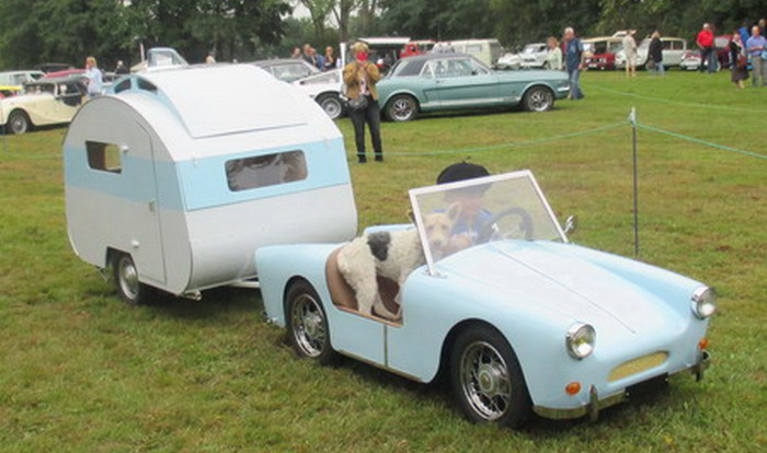 Il est temps de repartir voir les voitures exposées pendant que d'autres s'occupent de travailler leur digestion. Les voitures partent tandis que d'autres arrivent... une exposition en perpétuel mouvement. Nous croisons sur place d'autres montbrisonnais au volant de la belle TRIUMPH Hérald 1300 cabriolet de 1967: peut-être de futurs adhérents au CARMS. Les petits ne sont pas oubliés avec ce jeune garçon coiffé de son béret et accompagné de son fidèle chien au volant d'une voiturette cabriolet et de sa caravane à l'échelle junior... un futur passionné de voitures de collection dans quelques années.