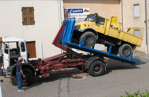 C'est donc en 2006 que l'UNIMOG pris la route de Champdieu (Loire). Un monument chaussé sur le véhicule de remorquage, tout Champdieu en est