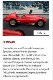 Cette 39ème édition fête les 70 ans de FERRARI. 42 voitures de la célèbre marque au cheval cabré de Maranello prêtées par des musées dont celui de MULHOUSE, des concessionnaires automobiles et leurs clients, ainsi que des passionnés Une mythique 250 GTO considérée comme l'une des meilleures Ferrari de tous les temps. Un plateau exceptionnel de supercars avec: 250 LM 288 GTO F40 599 GTO La FERRARI Arpenta ou F70 qui coûte la bagatelle de 1 250 000 (963 cv pour 370 km/h) BB 512 LM. Le plateau principal est lui composé d'une 250 TDF 250 GT SWB chassis court 250 GT LUSSO 250 GT 275 GTB 2 et ma préférée le FERRARI 365 GTB 4 Daytona (vue en vente sur le stand des Ateliers des Coteaux à 895 000 - Même en cassant mon PEL et mon contrat d'assurance-vie, impossible de posséder une telle auto)- Parmi tous ces chefs d'oeuvres automobiles mes préférées sont quand même les modèles des années 50 à 70.